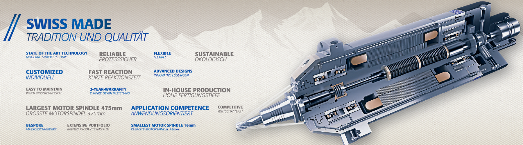 瑞士IBAG電主軸公司 成立于1941年2月,并于1960年開始研發電主軸。到目前,瑞士IBAG電主軸已成為業界影響深遠、廣為推崇的電主軸品牌。作為最早進入中國市場的電主軸品牌,憑借優良的品質、優美的外觀,簡潔可靠的結構設計,IBAG電主軸不僅為中國高端制造提供了高端電主軸選擇,同時也為國內電主軸生產企業起到了模范作用,促進了國內電主軸行業最初的發展。瑞士IBAG電主軸公司多年僅聚焦于電主軸的研發和生產,電主軸產品應用領域廣泛,如微孔加工、精密雕刻、鏡面加工、鉆攻、各式加工中心、雙軸擺頭等,瑞士IBAG電...